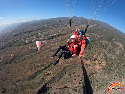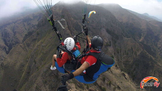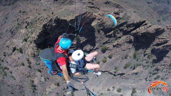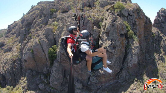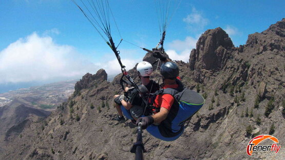 A moment of romance and excitement: couple enjoying paragliding together over the impressive rocky mountain of El Conde, Tenerife. A memory shared in the skies of this magical island."