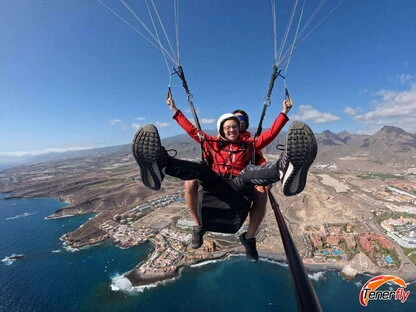 Immerse yourself in pure happiness enjoying a paragliding flight over Adeje, Tenerife. This image captures the essence of pleasure in the heights, where excitement meets the serenity of the Canarian skies. A moment of delight!